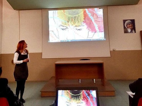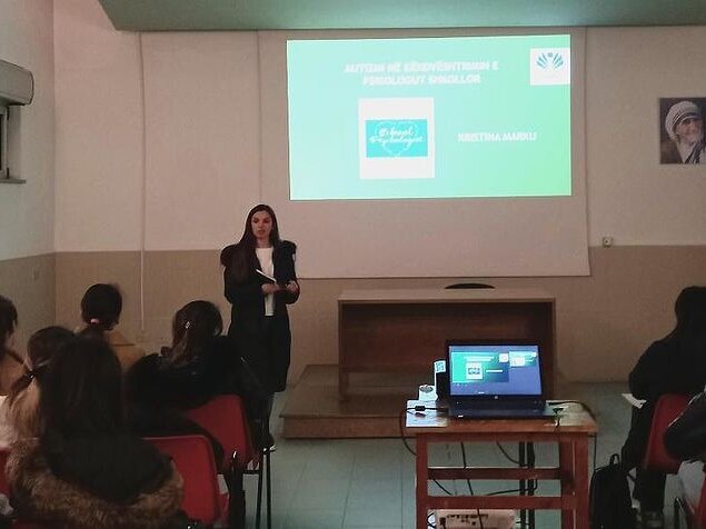 Më pas psikologia e shkollës “Maria Ndihmëtare” Msc. Kristina Marku shpjegoi mënyrën se si punohet me fëmijët me autizëm në shkollë, duke theksuar që në çdo klasë të ciklit parashkollor dhe të arsimin nëntëvjeçar ka një fëmijë me aftësi ndryshe që bëhet pjesë e përbashkët e aktiviteteve të klasës duke integruar punën individuale me mësuesin mbështetës, me gjithëpërfshirjen me klasën përmes një ndërhyrjeje që kombinon aspektet shkollore me aktivitetet sportive e muzikore.
