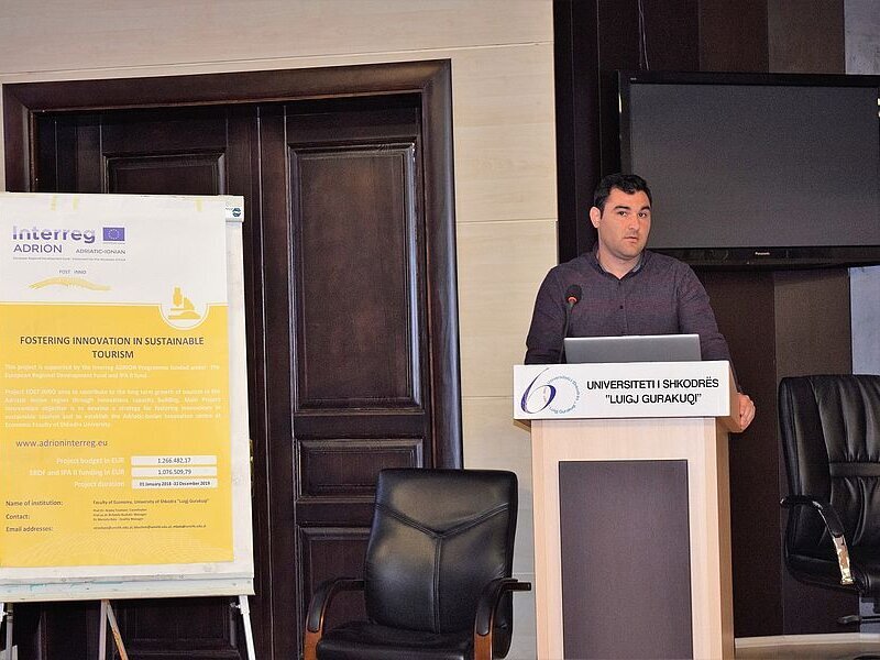 Further, the speech was received by prof.Dr.Arjeta Troshani, who from the position of the coordinator of the project FOST INNO, thanked the tourism businesses that participated in the public competition of innovative ideas for sustainable tourism and expressed the importance of opening the University to the community the business and the impact that the Faculty of Economics should have in all the developments of the North American economy. Prof.Troshani stressed the importance of the FOST INNO project where in the first year of its implementation a Sustainable Tourism Development Strategy was developed in the Adriatic-Ionian Region, while the following is being worked on to implement the activities of the Innovation Center in Sustainable Tourism in the Adriatic-Ionian Region in cooperation with tourist businesses, representatives of the Municipality, Prefecture, District, professional tourism schools, NGOs and other stakeholders.