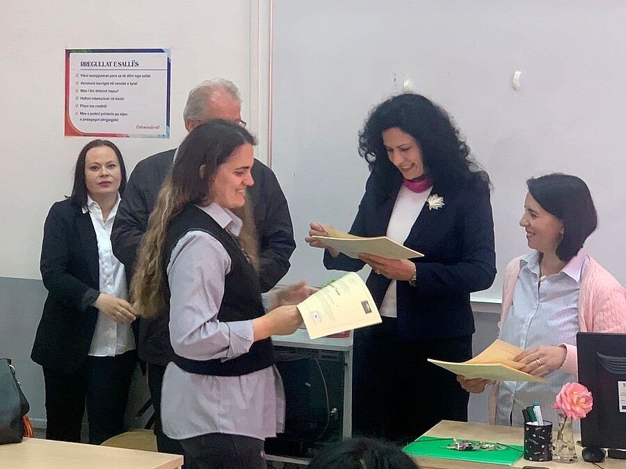 Në fund të trajnimit pjesëmarrësit u pajisen me certifikatën përkatëse e cila iu shpërnda mësuesve nga Dekani i FSHE-së Prof. dr. Fatmir Vadohej, nga përgjegjësja e LTEV Dr. Pranvera Kraja dhe nga dy pedagoget trajnere.
