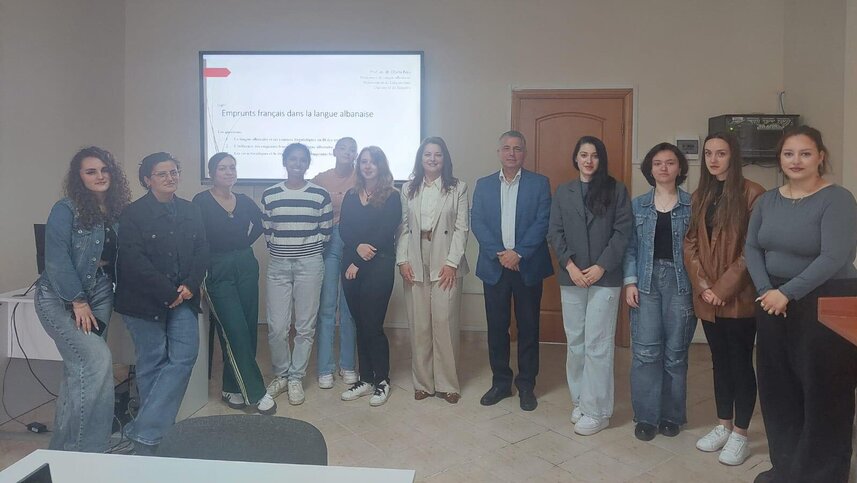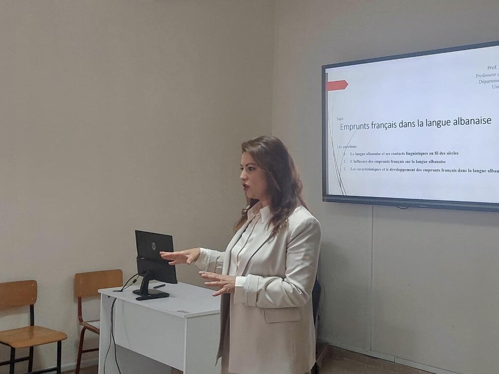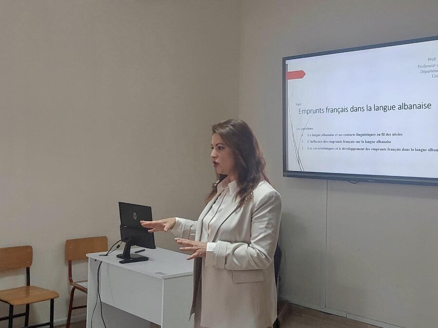 Studentët u pritën ngrohtësisht nga dekani i FSHSH, prof. Artan Haxhi, dhe nga drejtuesja e Departamentit të Gjuhësisë, prof. Orjeta Baja. Pas fjalëve përshëndetëse, prof. Baja mbajti një leksion me temë: “Emprunts français dans la langue albanaise”, duke analizuar ndikimin e frëngjishtes në shqipe përmes huazimeve leksikore.