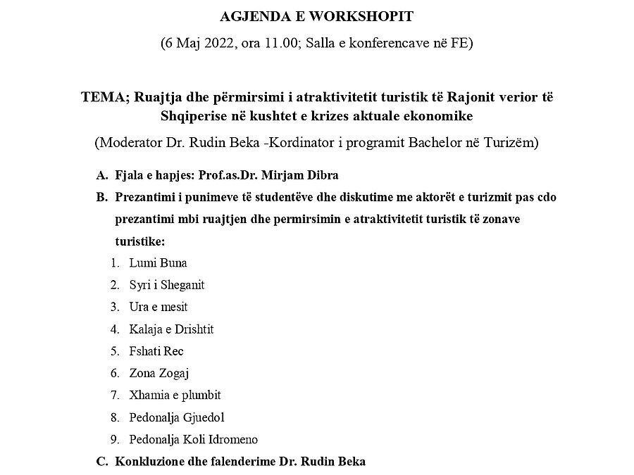 Departamenti i Turizmit i Fakultetit Ekonomik të Universitetit të Shkodrës me datën 06.05.2022 ora 11.00 në sallen e amfiteatrit në Fakultetin Ekonomik organizoi Workshopin: ‘Ruajtja dhe përmirsimi i atraktivitetit turistik në rajonin verior të Shqipërisë në kushtet e krizes aktuale ekonomike’. Morën pjesë përfaqsues të aktorve të turizmit në rajonin verior të vendit tonë që kontribojnë në zhvillimin e turizmit, staf akademik e kërkimor i Fakultetit Ekonomik, studentë të turizmit dhe të fushave të tjera të studimit të Fakultetit ekonomik të USH. Tematika e këtij workshopi mori vëmendjen e organizuesve dhe të pjesmarrësve për vete faktin se turizmi si sektor prioritar në vendin tonë është para sezonit kulmor turistik dhe turizmi ndodhet aktualisht përpara sfidave te reja të krizes gobale të shkaktuara si pasoje e luftës Rusi-Ukrahinë, kur akoma levizja turistike përballet me kufizime për shkak të pandemisë Covid 19. Në kushtet e tkurrjes së tregut turistik të Ukrahinës, Rusisë dhe Bjellorusisë, në kushtet kur konsumatorët kanë më pak para në dispozicion për udhëtime turistike si pasojë e rritjes se kostos se jetes nga rritja e cimimve te mallrave prej luftës Rusi-Ukrahinë, dhe si pasojë zingjir në kushtet e rritjes së cmimit të produktit turistik për shkak të rritjes së cimimevet ë inputeve që furnizojnë industrinë turistike, konkurrenca midis destinacioneve turistike për të tërhequr treg turistik është bërë edhe me e madhe në mënyrë që të riorentojë tregun turistik aktual drejt tyre. Tour operatorët vlersojnë që konsumatorët turistik në kërkim të destinacioneve të reja turistike, do orentohen për të vizituar Shqipërinë si një destinacion turistik i ri dhe shumë mikëpritës, me mundësi për vizituar brenda një turneu turistik varietet atraksionesh turistike për shkak të afërsisë gjeografike të tyre dhe si një destinacion turistik që ofron produkt turistik me cmime më të favorshme. Në këto kushte është e rëndësishme të ruajme dhe përmirsojmë atraktivitetin e zonave turistike në vendin tonë në mënyrë që turistët besnik dhe turistët e rinj të vijnë dhe të sjellin edhe të tjerë me vehte në të ardhmen. Rajoni verior i Shqipërisë është një destinacion turistik i rëndësishëm i vendit tonë për atraktivitetin turistik të trashigimisë natyrore dhe historiko-kulturore dhe traditës në mikëpritje. Duke vlersuar këtë situatë, studentët e vitit të tretë Bachelor në turizëm që janë në prag të diplomimit si specialist të turizmit, të udhëhequr nga pedagogët e lëndës ‘Planifikim dhe Zhvillim Turizmi’ : Prof.as.Dr. Mirjam Dibra, Erkanda Kotrri Msc dhe Sajeda Hysaj Msc, të nxitur edhe nga feedback real për atraktivitetin turistik të rajonit të Shkodrës dhe Malësisë së Madhe, i marrë nga studentët dhe pedagogët e turizmit të dy Universiteteve belgë gjatë realizimit të një bashkëpunimi të FEUNISHK me këto dy Universitete, punuan për të bërë vlersimin aktual të atraktivitetit të nëntë zonave turistike në rajonin verior të Shqiperisë: Zona e Lumit Buna, Zona Zogaj, Syri i Sheganit, Fshati Rec, Ura e Mesit, Kalaja e Drishtit, Xhamia e Plumbit, Lagjia Gjuedol dhe Pedonalja Koli Idromeno. Ata gjithashtu ngriten problematikat e konstatuara në këtë zona që e gërryejnë cilësinë e atraktivitetit turistik të zonës dhe dhanë ide për zgjidhje, si dhe ide për mundësi potencialesh të tjera turistike të zonave. Ato e paraqiten këtë vlersim edhe nëpërmjet vidiove të realizuara. Problematikat që kërkonin zgjidhje të shpejta ishin: prania e mbeturinave, mungesa e sinjalistikës turistike, mungesa e ndriçimit dhe e kamerave të sigurisë në objekte monumente te trashigimisë kulturore, nevoja për disa merimetime të domosdoshme, gjelbërimi me lule tradicionale të qytetit të Shkodrës në pedonalen Koli Idromeno dhe Gjuedol, respektimi i rregullave të lëvizjes pa bicikleta e motorra në pedonalen Koli Idromeno, promovim më i fuqishëm turistik etj. U dhanë edhe mjaft ide të rritjes së atraktivitetit turistik të këtyre zonave që mund të jenë projekte për tu ndërmarrë në të ardhmen. Problematikat dhe idetë e tyre u diskutuan edhe nga përfaqësuesit e aktorve të turizmit si sektorit publik lokal ashtu edhe te drejtorisë së zonave të mbrojtura në Shkodër dhe te Drejtorisë rajonale të trashigimisë kultuore Shkodër, në mënyrë që të gjithë akorët bashkë të kontribojmë për të ruajtur dhe përmirsuar atraktivitetin e këtyre zonave turistike të rajonit verior të vendit tonë.