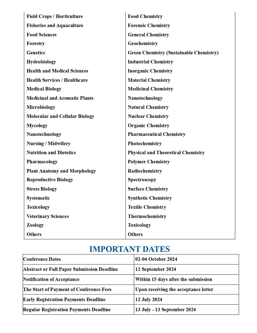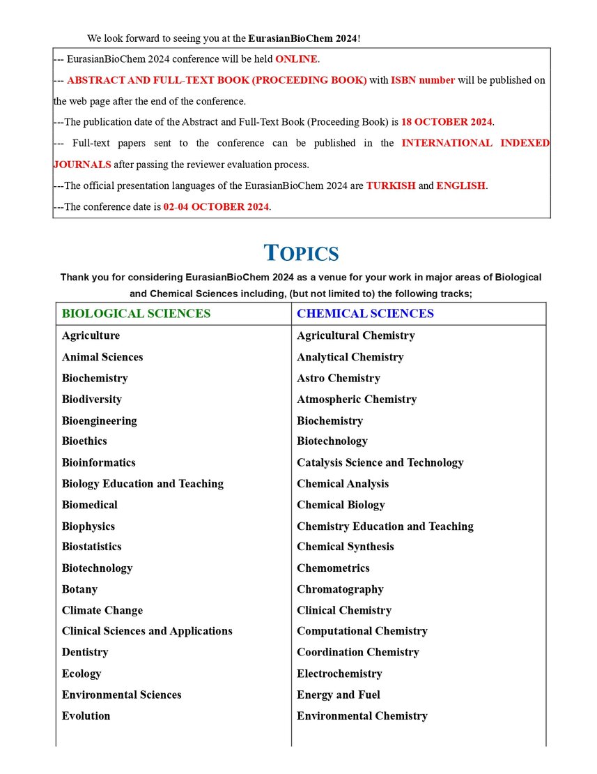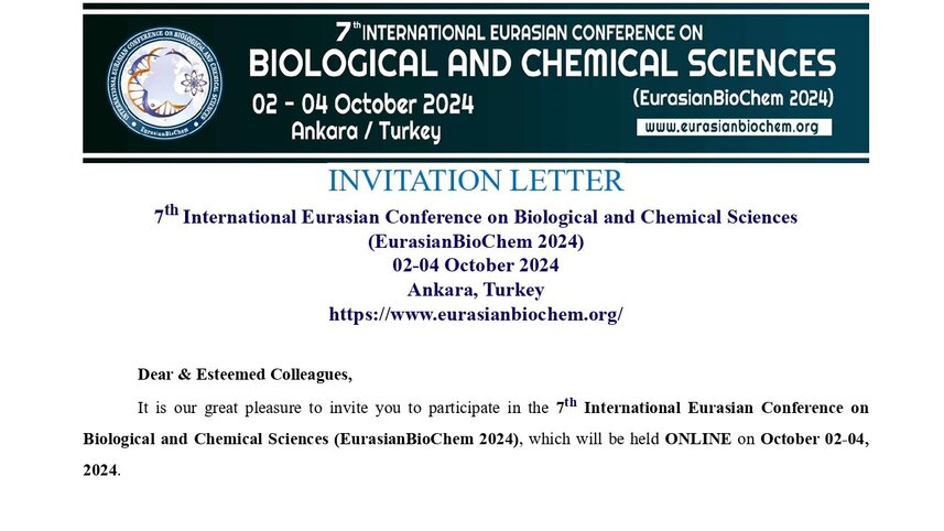 7th International Eurasian Conference on Biological and Chemical Sciences (EurasianBioChem 2024) 02-04 October 2024 Ankara, Turkey