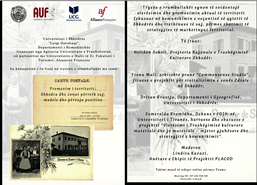 Ne kuadrin e projektit PLACOD, "Krijimi i nje platforme digjitale ne gjuhe te huaja per promovimin e territorit", financuar nga AUF, qe po realizohet nga Departamenti Romanistike, diten e enjte, date 10.10.2024 do te mbahet nje tryeze e rrumbullaket me teme "Promovimi i territorit; Shkodra dhe zonat perreth; modele dhe përvoja pozitive", nga ora 11.00 -12.00, ne mjediset e FGJH-se.