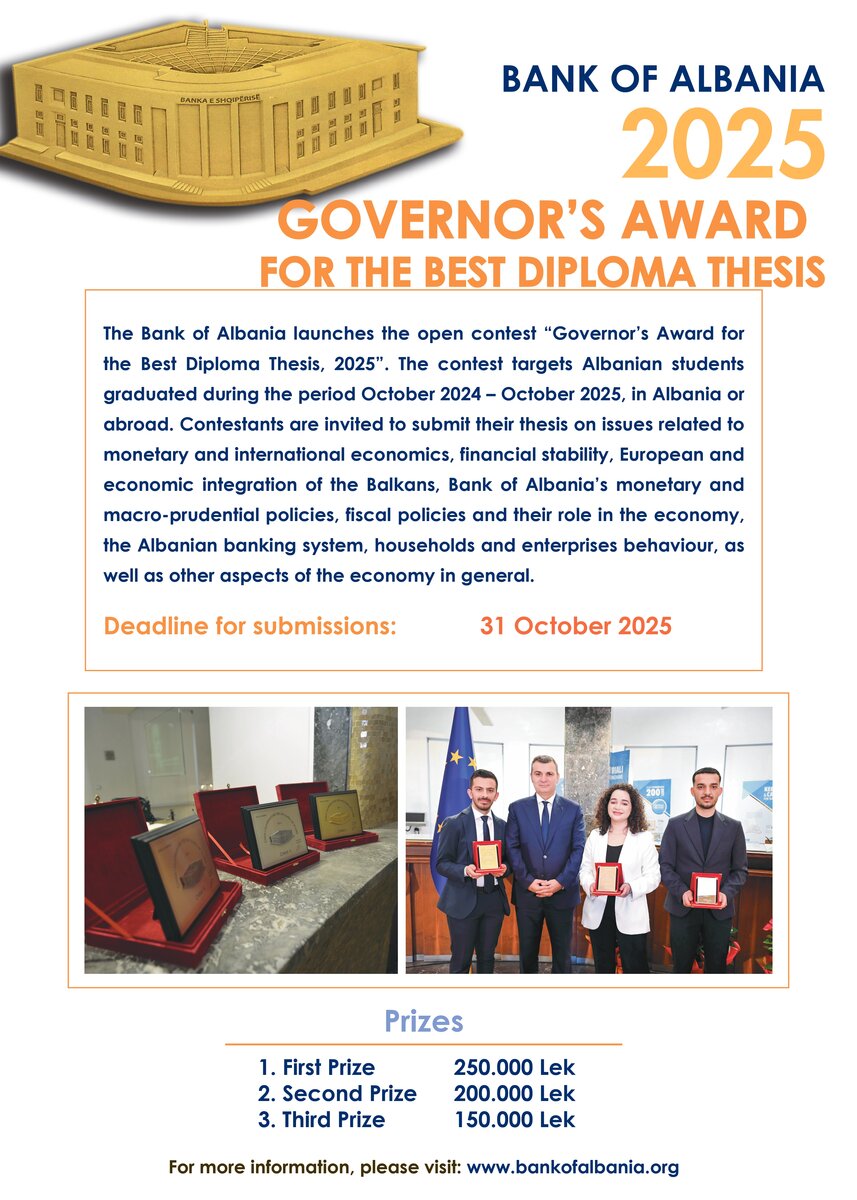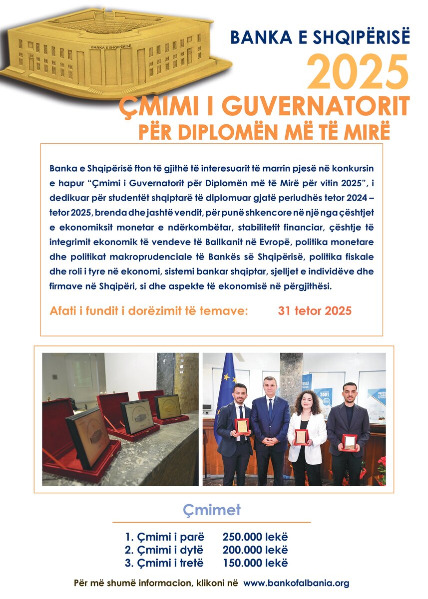 1. Në konkurrimin për Çmimin e Guvernatorit për Diplomën më të Mirë për vitin 2025, mund të marrë pjesë çdo student shqiptar i diplomuar gjatë periudhës tetor 2024 – tetor 2025, në një nga çështjet e ekonomiksit monetar e ndërkombëtar stabilitetit financiar, çështje të integrimit ekonomik të vendeve të Ballkanit në Evropë, politika monetare dhe politikat makroprudenciale të Bankës së Shqipërisë, politika fiskale dhe roli i tyre në ekonomi, sistemi bankar shqiptar, sjelljet e individëve dhe firmave në Shqipëri, si dhe aspekte të ekonomisë në përgjithësi.