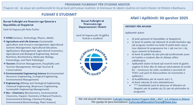 Njoftim për ish-studentët/alumni e interesuar per nje program kerkimor ne kuader te Programit Fulbright Visiting Scholar Fulbright Visiting Scholar Program 2026 – 2027 - U.S. Embassy in Albania