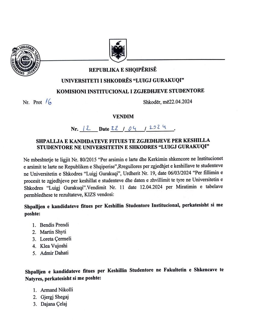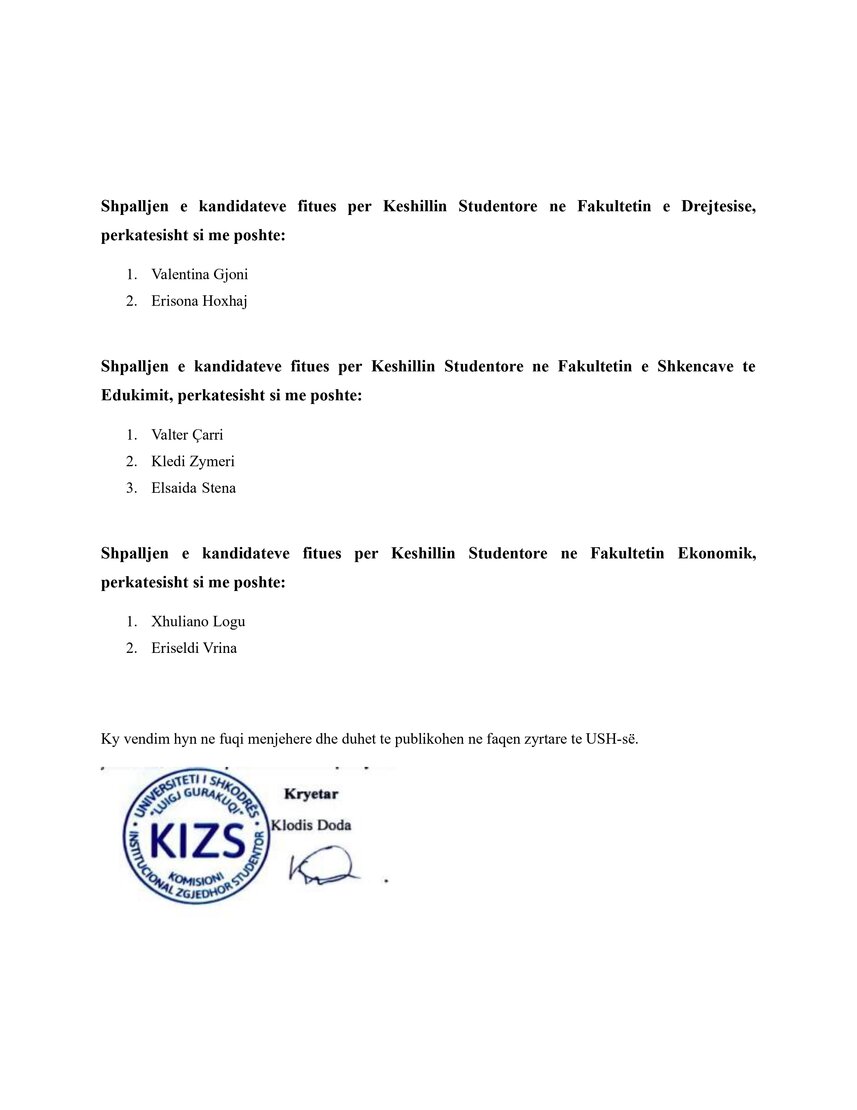 Shpalljen e kandidatëve fitues për Këshillin Studentor